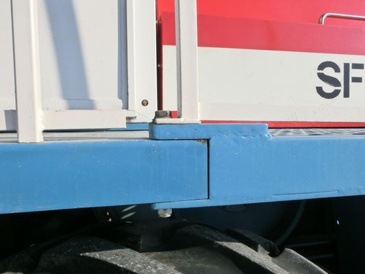 Since a collision protection for the chute was unfortunately not available ex works, a self-build solution was installed on this SF 6.The centerpiece of this construction is the "bearing 03-063 824" which is swiveling in the direction of travel on the right by means of lubricated brass bushings. Picture: right view from above.