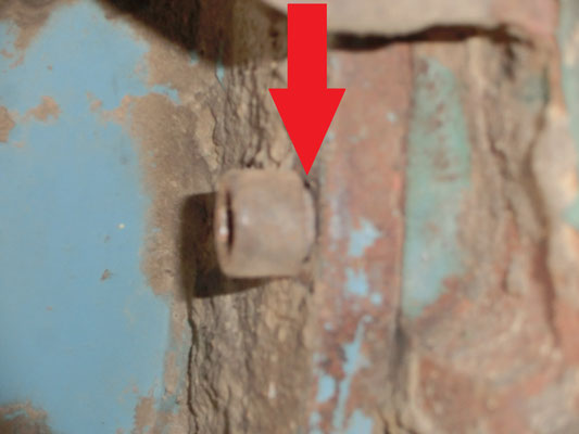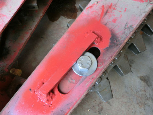 Due to the asymmetrical tensile force of the intake chains at the four middle divider tips of the MG 32 and MG 33, massive wear occurs on the frame plate and the M20 bolts of the tensioning wheels, see the pictures below: